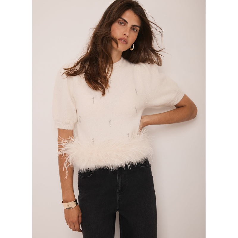 APTG13087855Cream Embellished Feather Trim Knit Top XS