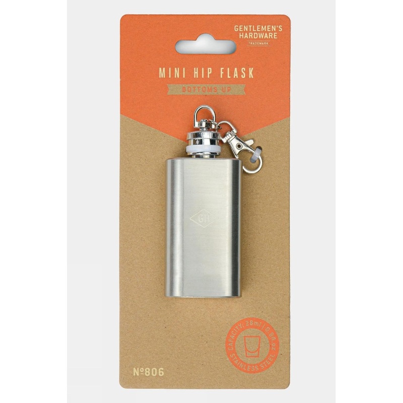 Sip in style with this compact Mini Hip Flask from Gentlemens Hardware. Designed for easy portability, it features a keychain attachment and is crafted from durable stainless steel, holding up to 28 ml of your favorite beverage. This mini flask makes an ex