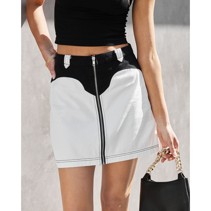Houston Denim Colorblock Front Zip Mini Skirt Black/White S