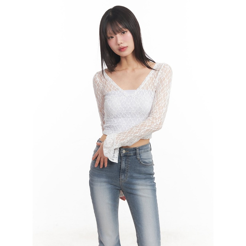 Sheer Lace Long-Sleeve Crop Top CA522 White S/M