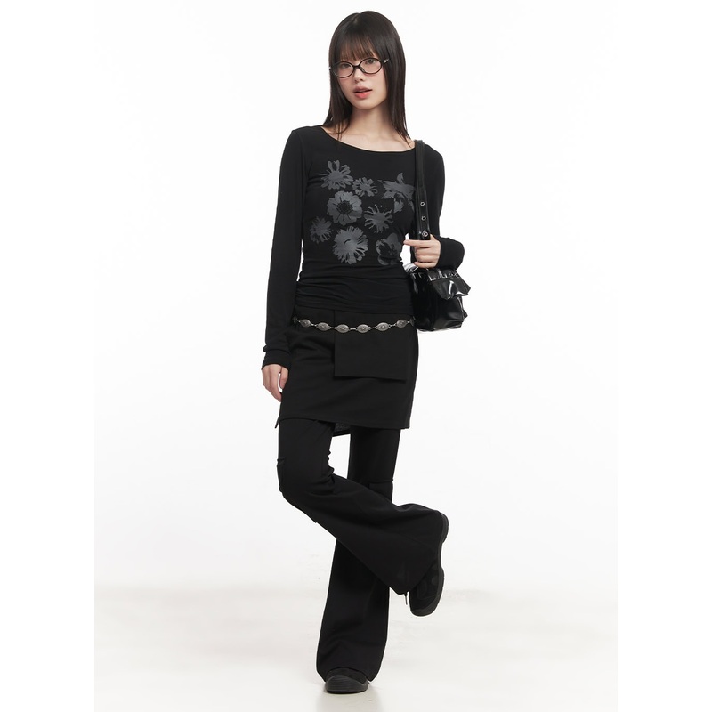 Slim-Fit Flared Pants & Wrap Skirt Set CM520 Black S/M