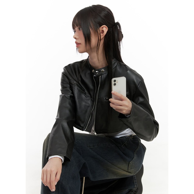 Product DetailStyle : Street, AcubiDetail : Buttoned, Zip upPrint : SolidMaterial : PolyurethaneSleeve : Long sleeveLength : CropFit : Slim fitPolyurethane100Color : Black, SilverMade in KoreaModel SizeModel is wearing size S/M and the color Black.Height :