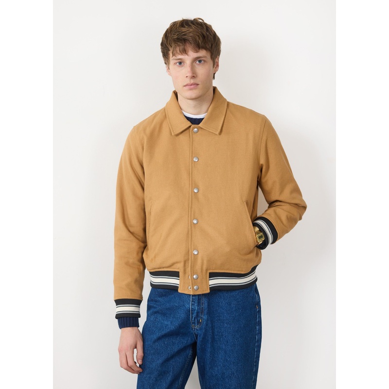 - Features: Men’s varsity bomber in tan, crafted from heavyweight cotton. Featuring silver snap fastenings, jetted welt pockets, and chunky rib detailing, this. bomber jacket from the Percival x Ilaria collection offers a relaxed yet stylish look with all-day comfort.